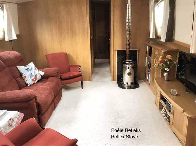 Le salon confortable dispose de grandes fenêtres, poêle Refleks, canapé inclinable, table à manger pliante, TV et HiFi