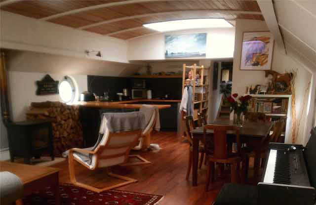 Vaste logement d'environ 100 m2, la péniche a gardé son aspect industriel tout en conférant a ses habitants un grand confort de vie